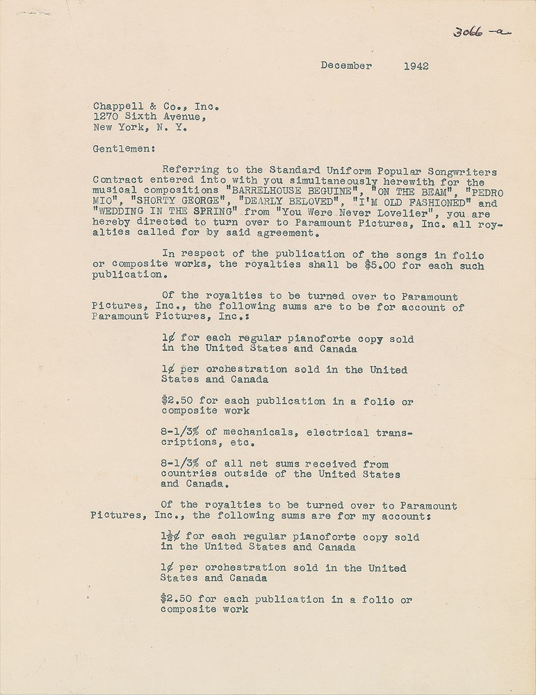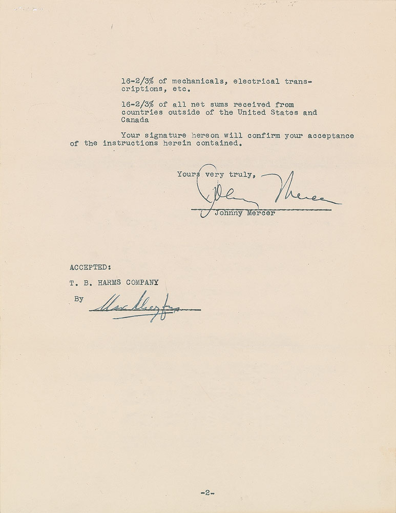 Academy Award-winning lyricist (1909-1976) who penned such classics as 'One for My Baby,' 'Days of Wine and Roses,' and 'Moon River.' DS, two pages, 8.5 x 11, December 1942. Agreement between Mercer and the T. B. Harms Company, in which the latter are to "turn over to Paramount Pictures, Inc. all royalties called for" from the 1942 film 'You Were Never Lovelier,' which includes the musical compositions 'Barrelhouse Beguine,' 'On the Beam,' 'Pedro Mio,' 'Shorty George,' 'Dearly Beloved,' 'I'm Old Fashioned,' and 'Wedding in the Spring.' Signed at the conclusion in fountain pen by Mercer. In fine condition.