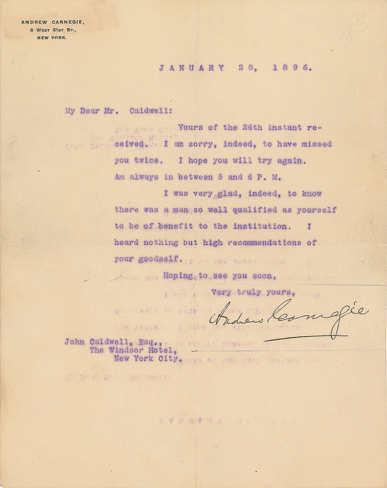 TLS, one page, 7.75 x 9.75, personal letterhead, January 28, 1896. Letter to John Caldwell, in full: "Yours of the 26th instant received. I am sorry, indeed, to have missed you twice. I hope you will try again. Am always in between 5 and 6 P. M. I was very glad, indeed, to know there was a man so well qualified as yourself to be of benefit to the institution. I heard nothing but high recommendations of your goodself. Hoping to see you soon." In very good to fine condition, with scattered creasing.