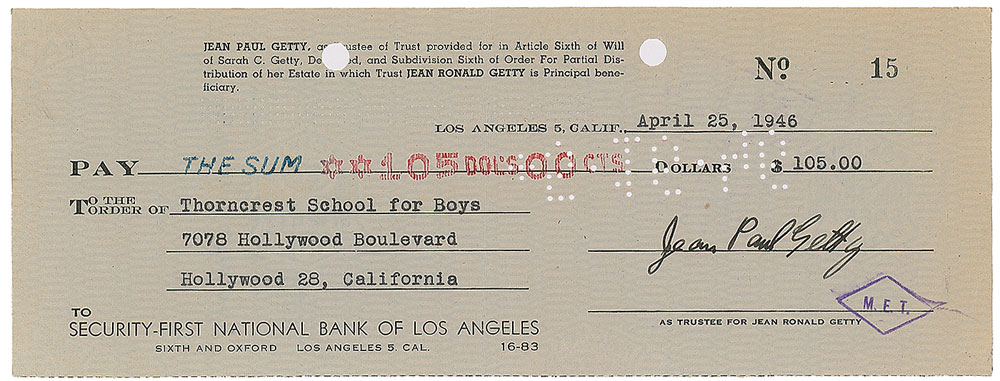 Famed industrialist and oil man (1892-1976) known as a collector of art and antiquities. Personal trust check, 8.5 x 3.25, filled out in type and signed by Getty, "Jean Paul Getty," payable to Thorncrest School for Boys for $105, April 25, 1946. In fine condition.
