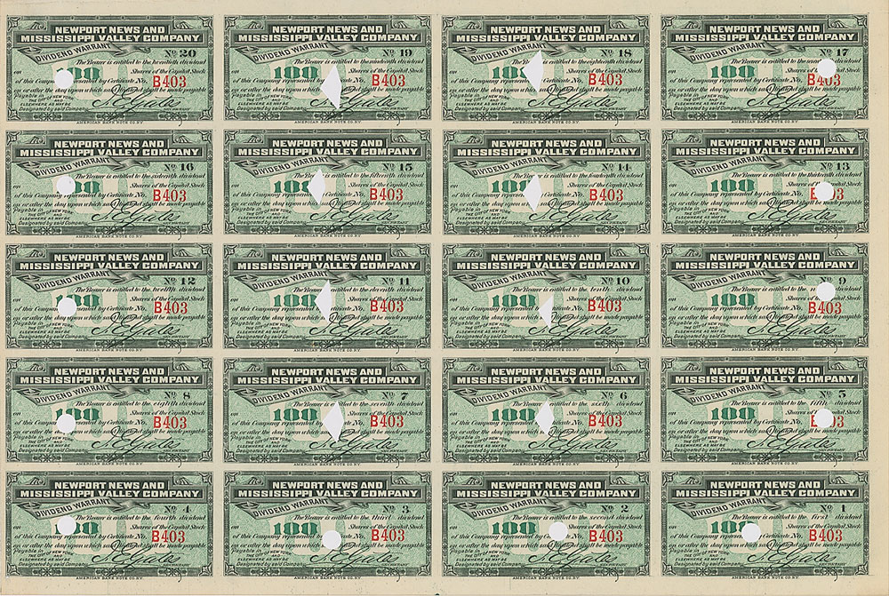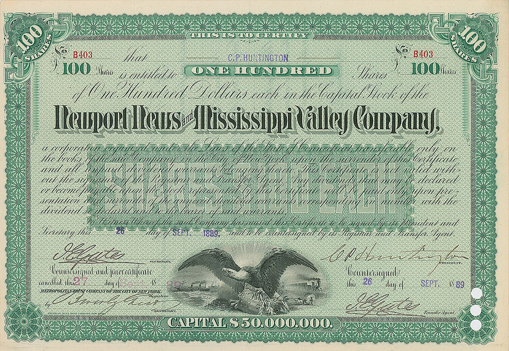 Railroad industrialist (1821-1900) known as one of the 'Big Four' of western railroading. Partly-printed DS, signed “C. P. Huntington,” one page, 11.5 x 15.5, September 26, 1889. Stock certificate issued to "C. P. Huntington" for 100 shares of capital stock in the Newport News and Mississippi Valley Company, signed at the conclusion by Huntington as president. Twenty dividend coupons are attached to bottom of certificate. In fine condition, with several unobtrusive cancellation holes.