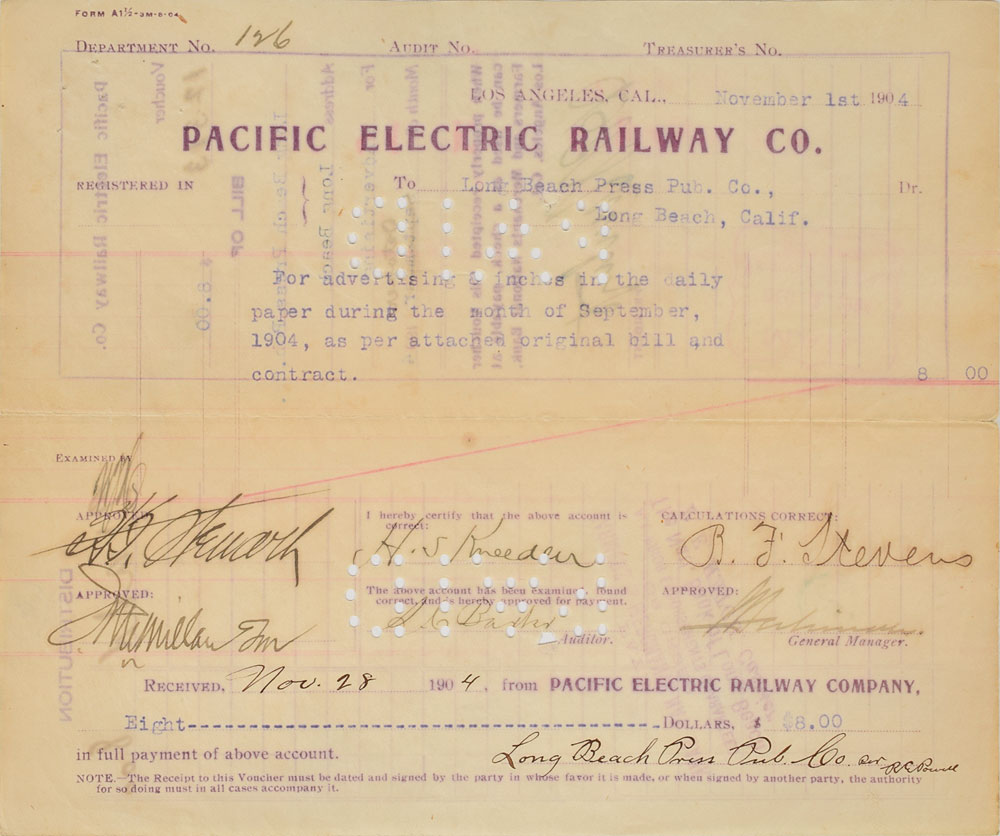 Railroad magnate and collector of art and rare books (1850-1927). DS, signed “H. E. Huntington,” one page both sides, 8.25 x 6.75, November 1, 1904. Pacific Electric Railway Company pay voucher for $8.00 for an advertising invoice from the Long Beach Press Pub. Co., endorsed on the reverse by Huntington as president of the railway. In fine condition.