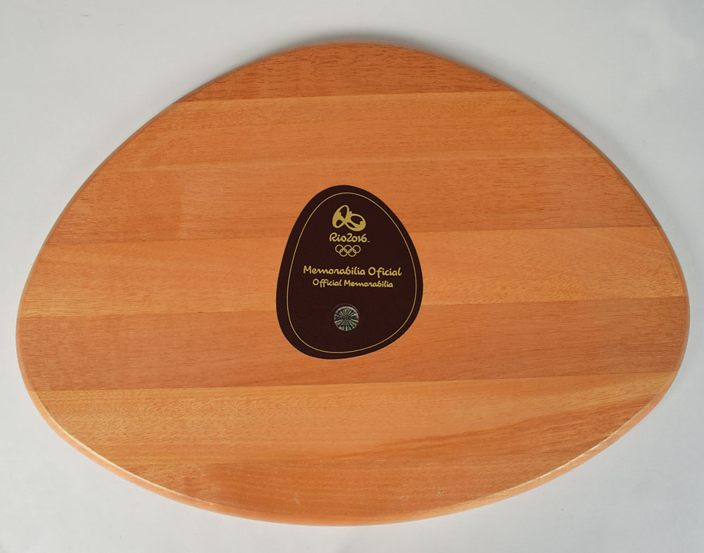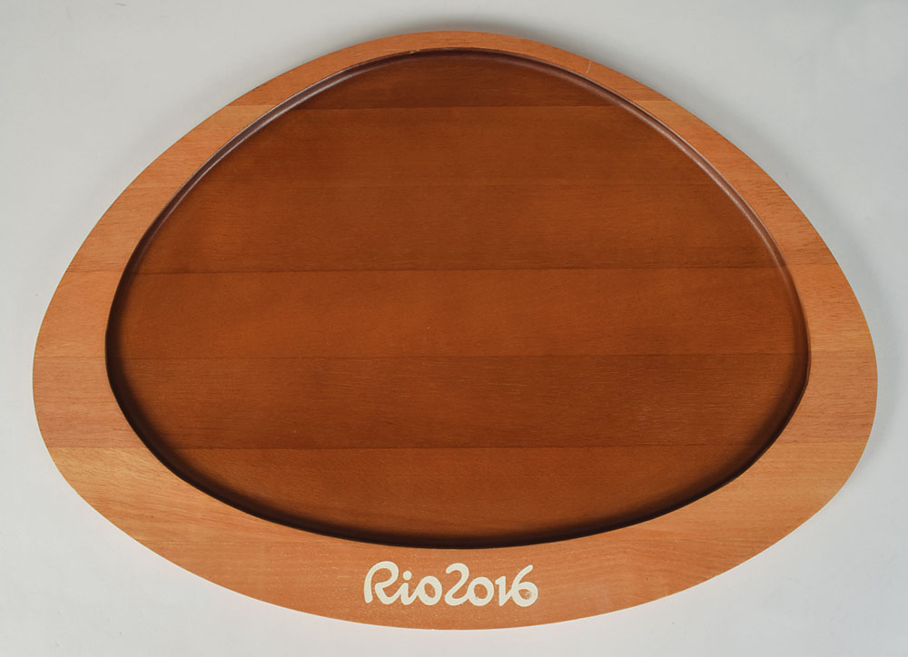 Attractive official Rio 2016 Summer Olympics wooden award presentation tray, measuring approximately 21.5 x 15.75 x .5, emblazoned on the front rim with white text, "Rio 2016." Reverse bears an affixed leatherette Rio memorabilia label. Accompanied by an official Rio certificate of authenticity. During the award ceremonies, medals and trophies were carried to winning athletes upon these wooden trays.