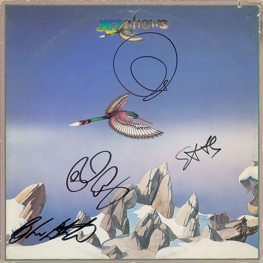 Yesshows album signed on the front cover in black felt tip by Steve Howe, Alan White, Rick Wakeman, and Jon Anderson. In fine condition, with light scuffing, and a discount cut and old adhesive residue to the upper right corner. The record is included. Consignor notes that the Anderson and Wakeman autographs were obtained before a show at Cleveland's Hyatt Hotel, and the Howe and White autographs were obtained after a show at the DoubleTree Hotel in Cleveland.