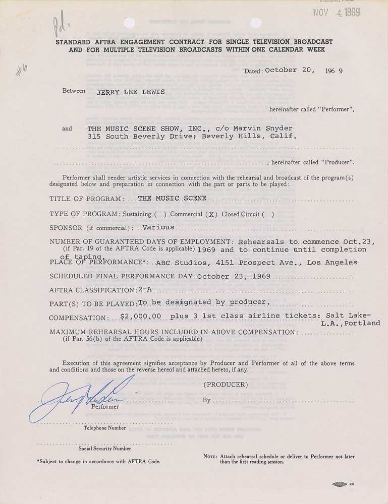 DS, one page, 8.5 x 11, October 20, 1996. Standard AFTRA Engagement television contract between Jerry Lee Lewis and The Music Scene Show, Inc., in which the former agrees to "render artistic services in connection with the rehearsal and broadcast" of the program The Music Scene on October 23, 1969, for a sum of $2000 and three first class airline tickets. Signed at the conclusion in blue ballpoint by Lewis. In fine condition, with staple holes to the upper left corner.