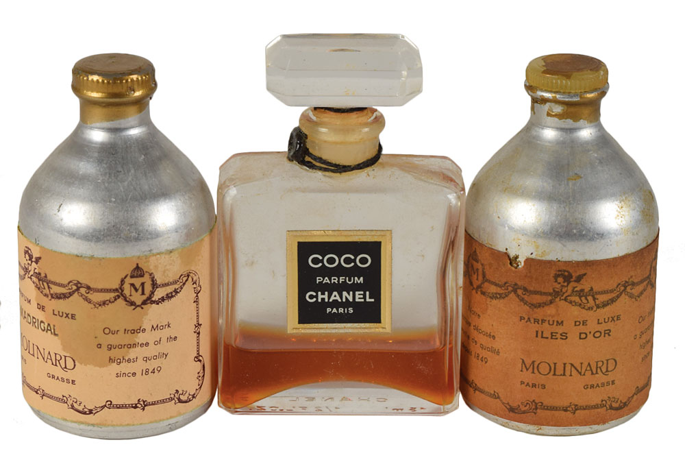 Three small bottles of perfume personally-owned and -used by Prince, including: two metal containers of Molinard of Paris luxury fragrances, “Iles d’Or” and “Madrigal,” with the latter having never been opened; and a 15 ml glass container of Coco Chanel perfume. In overall fine condition. From the collection of Prince’s former assistant, who notes that during filming of Under the Cherry Moon in Nice, France, Prince went on a private tour of the Parfumerie Molinard and given the two metal bottles; the Coco Chanel container was one of the partially empty perfume bottles she obtained from Prince. Accompanied by a letter of provenance.