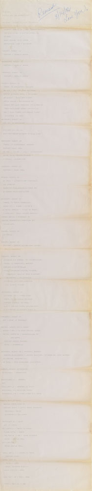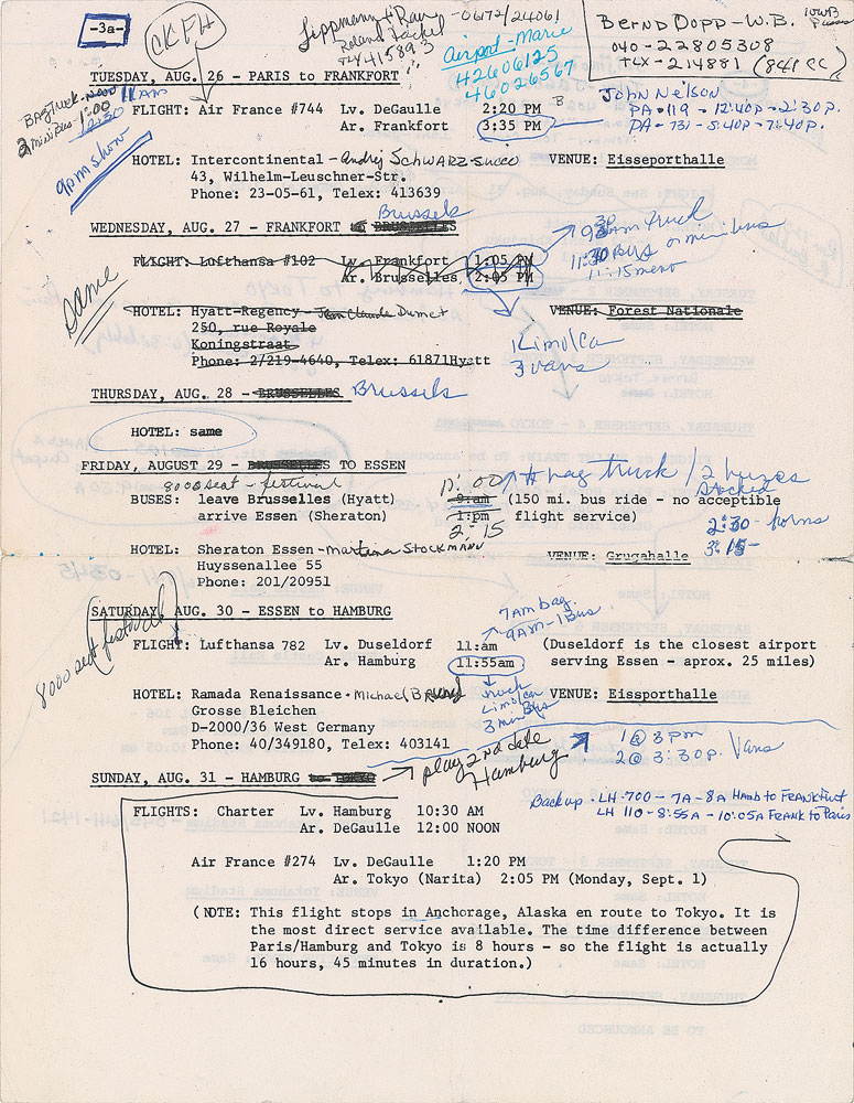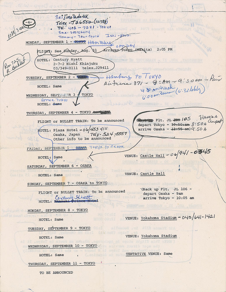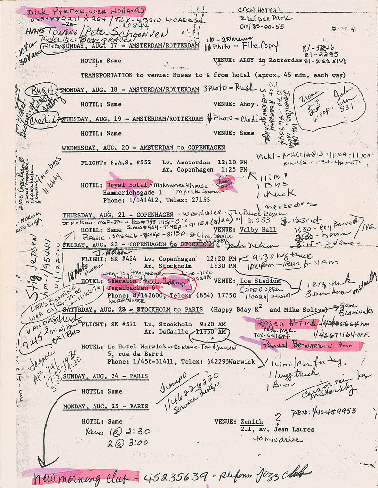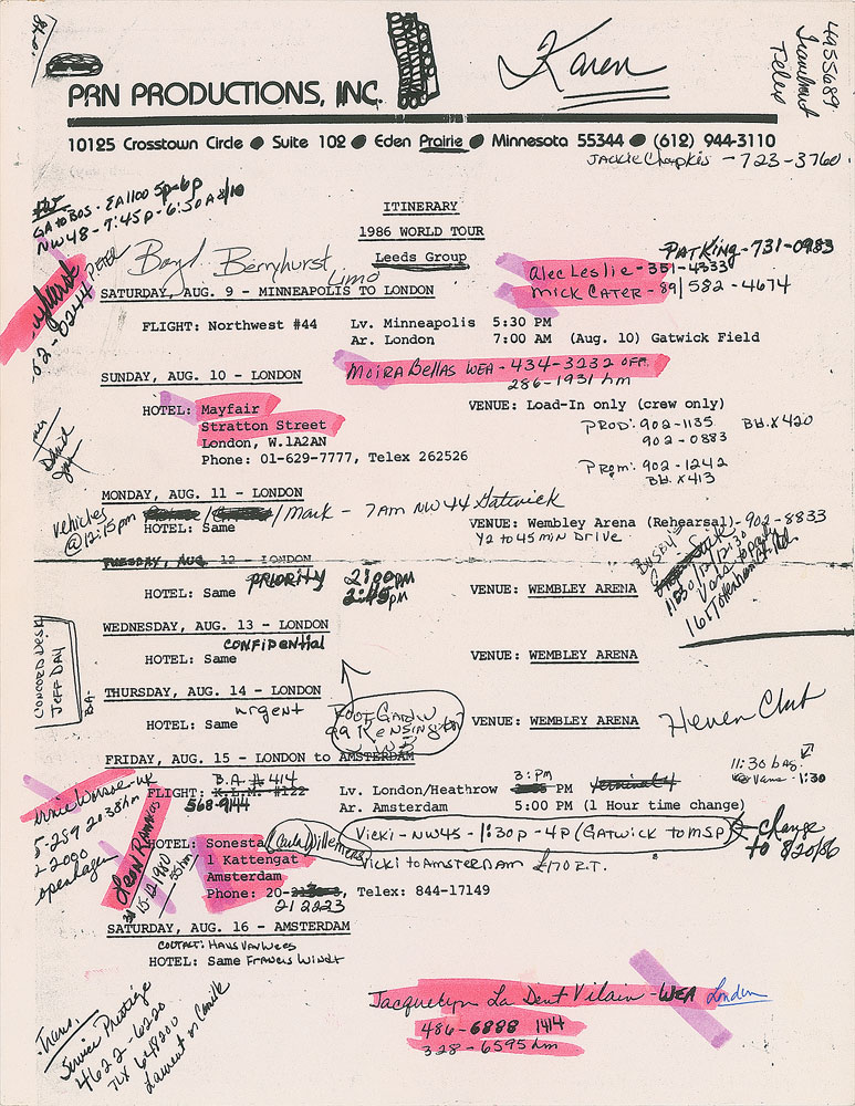 PRN Productions itinerary for Prince’s 1986 Parade Tour, four total pages, 8.5 x 11, dated August 9 to September 11, 1986. The first two pages are photocopies and are marked with pink and purple highlighter; the third page (front and back) is original and bears copious handwritten notes in blue and black ink. The itinerary chronicles the entirety of the European and Asian legs of the Parade tour, starting with a flight from Minneapolis to London on August 9th for Prince’s three legendary shows at Wembley Arena, and concluding with a “To Be Announced” concert in Tokyo, Japan, on September 11th. The pages are dense with phone numbers and detailed notations that list the contacts, hotels, venues, times, and travel arrangements for the trip. Also includes a dot matrix printout for the entire European and Asian Parade Tour itinerary. In fine condition, with expected wear from use. From the collection of Prince’s former assistant, who served as road manager during this tour, and accompanied by a letter of provenance.