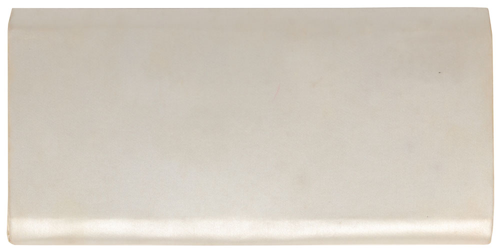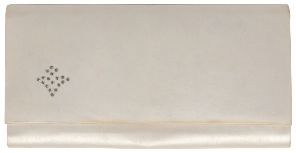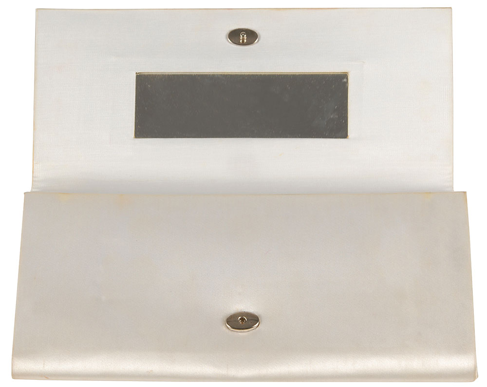 White satin-covered clutch purse used by Francesca Annis in her role as Mrs. Wellington in the 1986 movie Under the Cherry Moon, measuring 9 x 4.5 x .5, featuring a snap closure, mirror inside the cover flap, and jewels on the front. In very good condition, with scattered marks to exterior. From the collection of Prince's assistant Stachia Fiedler and accompanied by a letter of provenance. This can be seen in the opening credits and start of the movie, with a close-up about four-and-a-half minutes into the film.