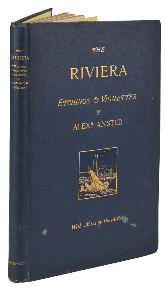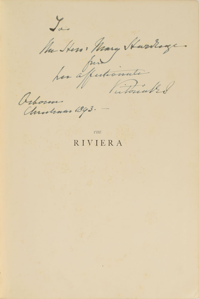 Signed book: The Riviera: Etchings & Vignettes by Alexander Ansted. London: Seeley & Co. Limited, 1894. Hardcover, 9.25 x 13, 80 pages. Signed and inscribed on the half-title page in black ink, "To The Hon: Mary Hardage, from her affectionate Victoria R. I., Osborne, Christmas 1893." Autographic condition: fine, with scattered faint foxing. Book condition: VG/None, with bumps to corners, wear at spine ends, and a few small but noticeable stains to the exterior.
