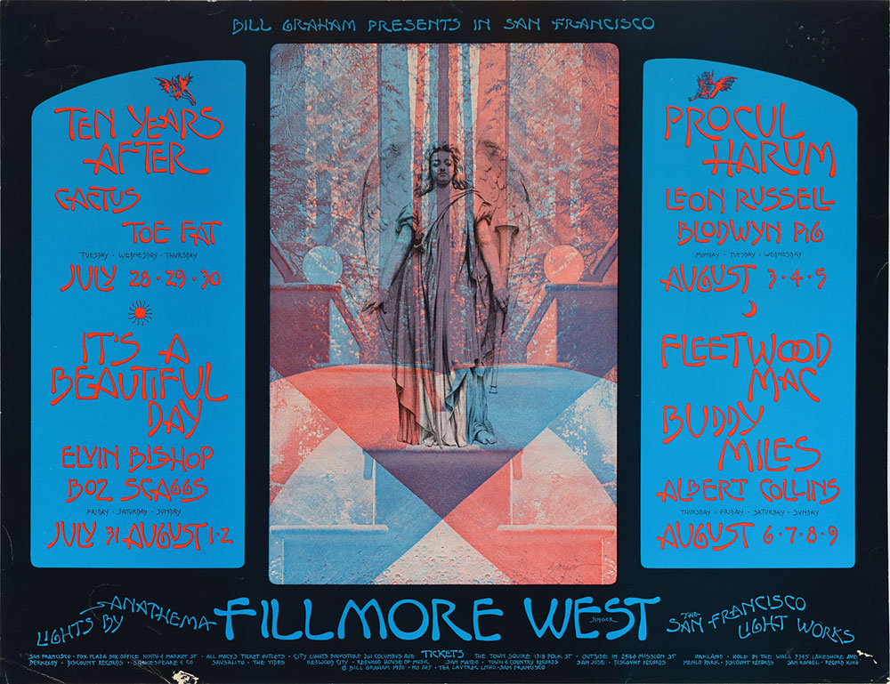 Excellent color 28 x 21.25 poster for a series of concerts presented by Bill Graham at San Francisco's Fillmore West in July and August of 1970. Performers and concert dates include: Ten Years After, Cactus, and Toe Fat on July 28, 29, and 30; It's a Beautiful Day, Elvin Bishop, and Boz Scaggs on July 31 and August 1 and 2; Procol Harum, Leon Russell, and Blodwyn Pig on August 3, 4, and 5; and Fleetwood Mac, Buddy Miles, Albert Collins on August 6, 7, 8, and 9. Lower border bears ticket information and notes that the light displays are to be organized by Lights by Anathema and The San Francisco Light Works. In fine condition, with some creasing to the edges.