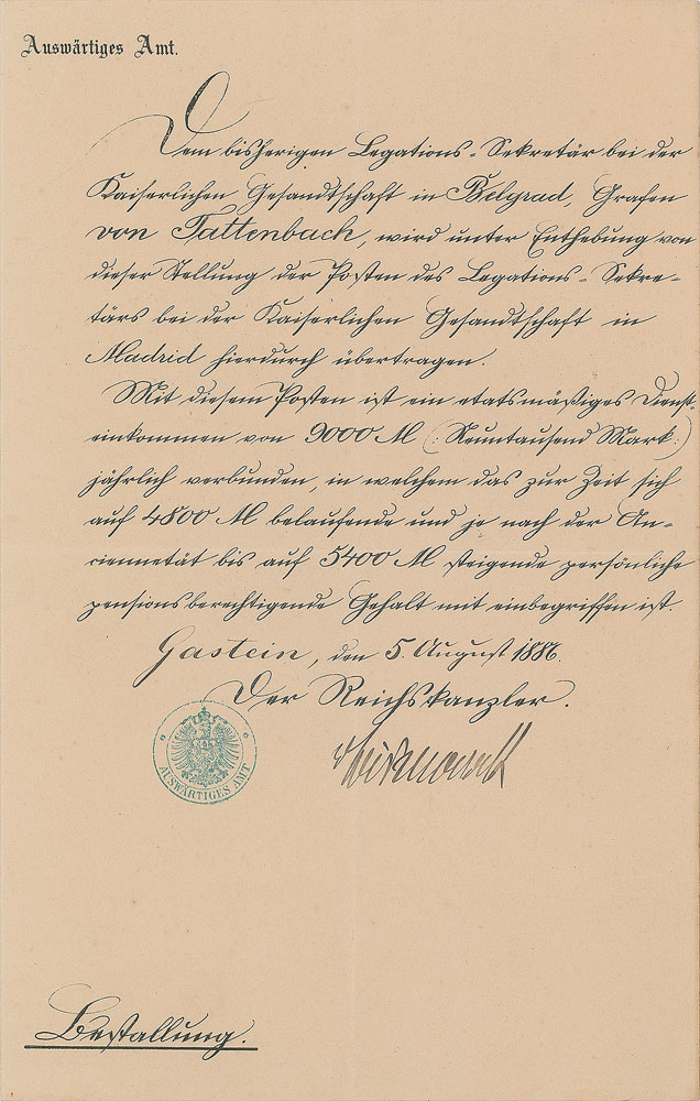 Prussian statesman and First Chancellor of the German Empire (1815-1898). Partly-printed DS in German, signed “v. Bismarck,” one page, 8.25 x 13, August 5, 1886. Certificate of appointment for Count Christian von Tattenbach as secretary of legation of the Imperial Legation of Belgrad to the Imperial Legation in Madrid. Signed at the conclusion by Bismarck. In fine condition, with a crease to the upper left corner.