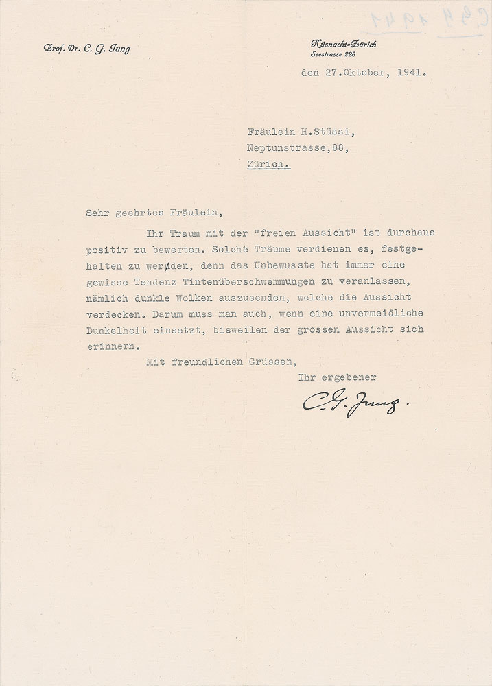 TLS in German, signed “C. G. Jung,” one page, 8 x 11.5, personal letterhead, October 27, 1941. Letter to H. Stussi, in full (translated): "Your dream with the 'free view' is absolutely positive. Such dreams deserve to be held fast, for the unconscious always has a certain tendency to cause ink floods, namely to send out dark clouds that obscure the view. Therefore, even when an inevitable darkness sets in, one must sometimes remember the great prospect." In fine condition.