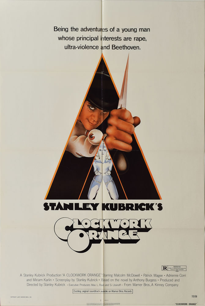 (Warner Brothers, 1971) Fabulous original color 27 x 41 one sheet movie poster for Stanley Kubrick's 1971 dystopian classic A Clockwork Orange, with prominent Bill Gold artwork and upper text reading: "Being the adventures of a young man whose principal interests are rape, ultra-violence and Beethoven." In fine, folded condition.