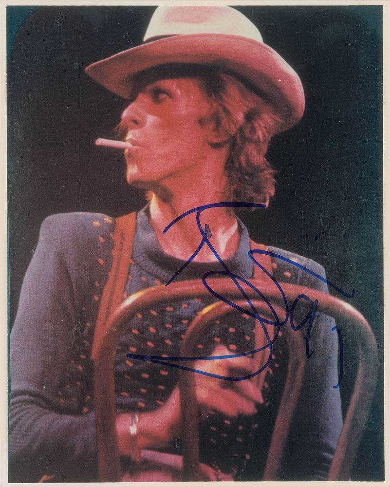 Color glossy 8 x 10 half-length photo of Bowie seated in a backwards chair and smoking a cigarette, signed in blue felt tip, "Bowie, 91." In fine condition. Originally obtained by in-person specialist Mike Wehrmann. Accompanied by full letters of authenticity from REAL and Beckett Authentication Services.