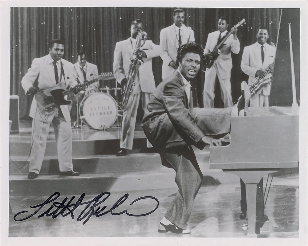 Glossy 10 x 8 photo of Little Richard enthusiastically playing the piano with his typical showmanship, signed in black felt tip. In fine condition, with a bit of light creasing to the upper left corner. Originally obtained by in-person specialist Mike Wehrmann.