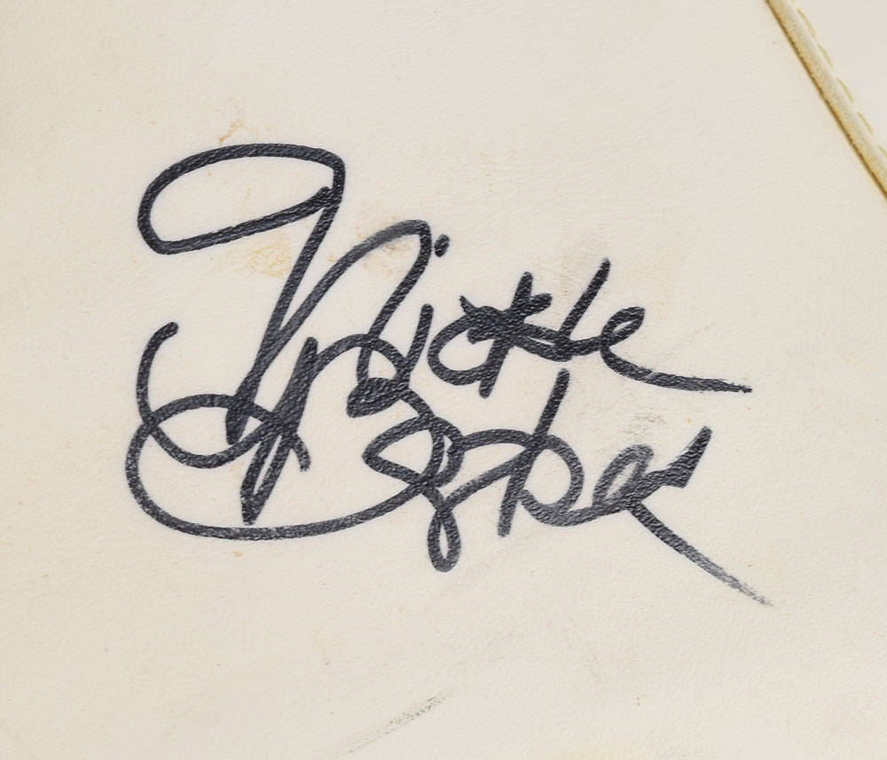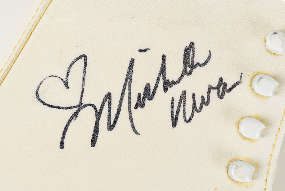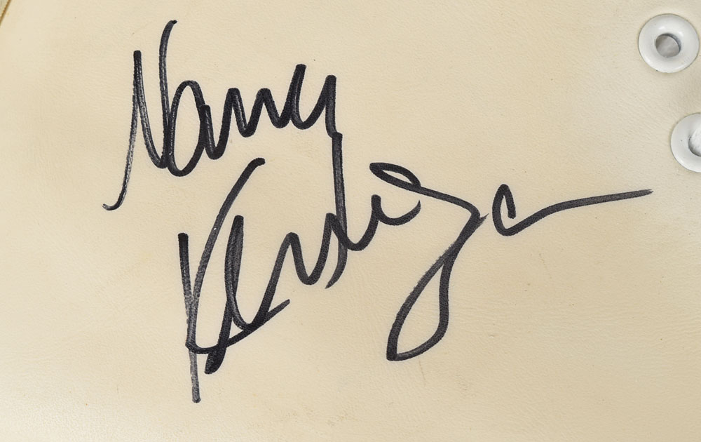 Group of four white figure skates, individually signed on the sides in black felt tip by Michelle Kwan, Katarina Witt, Nancy Kerrigan, and Nicole Bobek. In overall very good to fine condition, with some scattered scuffing and soiling. Originally obtained by in-person specialist Mike Wehrmann.