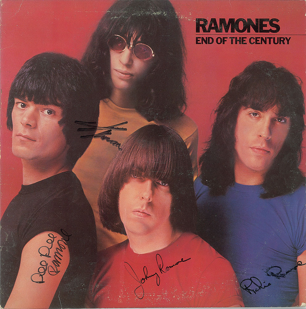 End of the Century album signed on the front cover in black felt tip by Joey, Johnny, Dee Dee, and Richie Ramone. In fine condition, with light scuffing and edge creasing. The record is included. A neatly signed and uninscribed example.