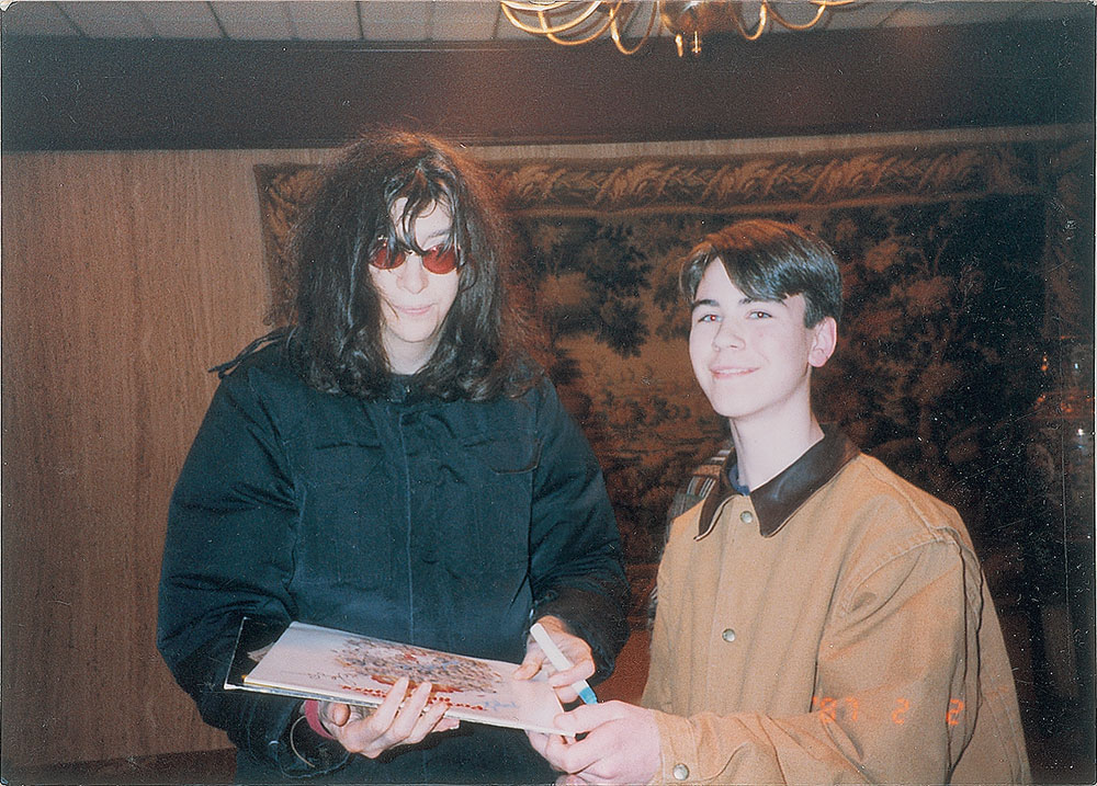 Rock 'N' Roll High School soundtrack album signed on the front cover in blue felt tip by Chuck Berry, in black felt tip by Johnny Ramone, and in blue paint pen by Joey Ramone, who adds "'95." In very good to fine condition, with dampstaining to the lower half and old sticker residue to the upper right. The record is included. Accompanied by a photo taken at the time of the Joey signing.