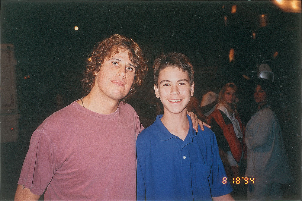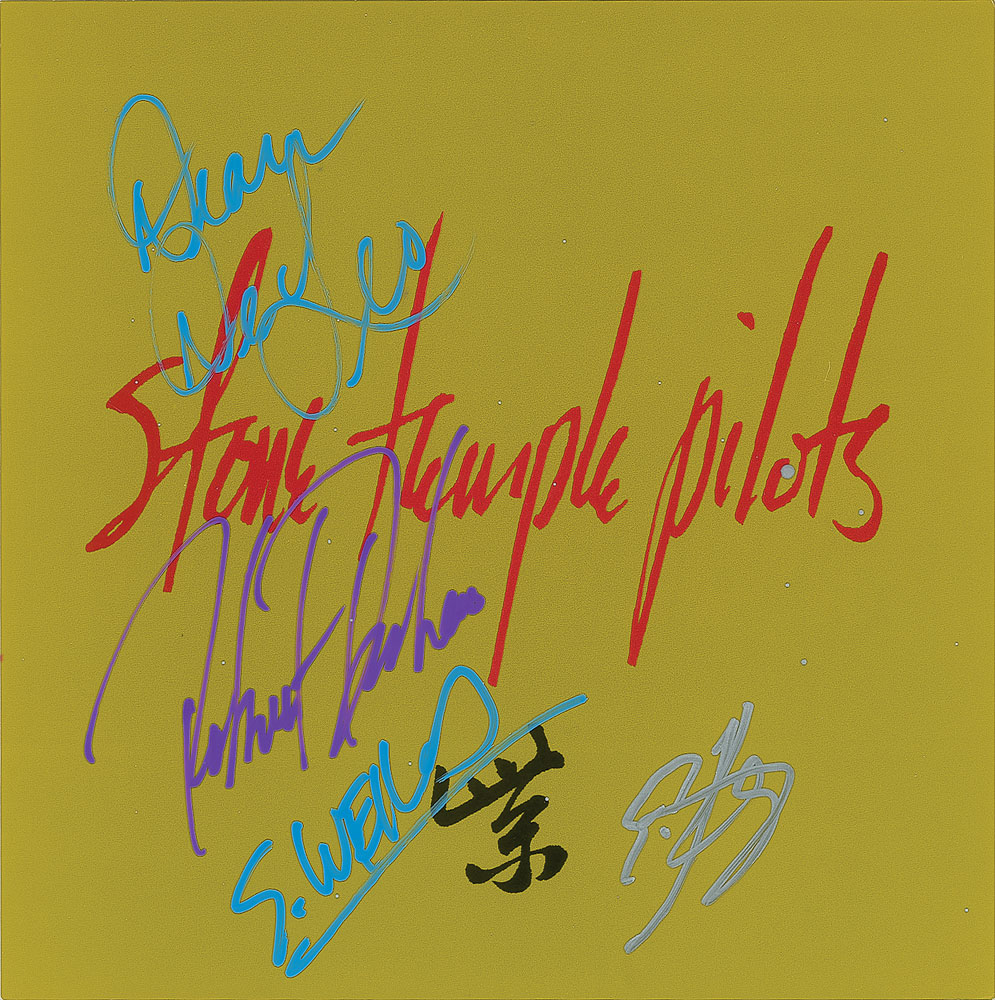 Purple album flat signed on the back in blue paint pen by Scott Weiland and Dean DeLeo, in purple paint pen by Robert DeLeo, and in silver ink by Eric Kretz. In fine condition. Accompanied by three photos taken at the time of the DeLeo and Weiland signings, each dated August 18, 1994.