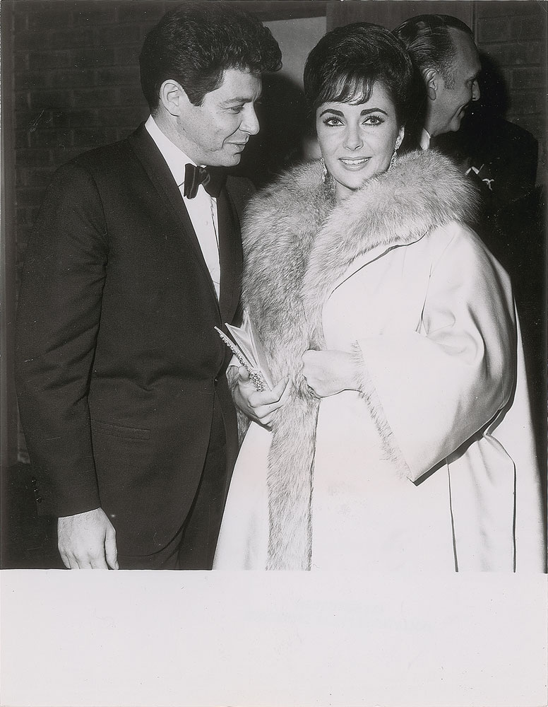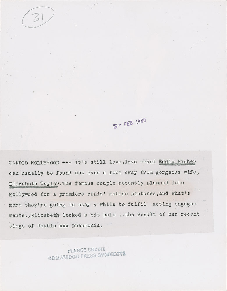 Original vintage glossy 7.25 x 9.25 silver gelatin photo showing Elizabeth Taylor with husband Eddie Fisher in 1960. Reverse is stamp-dated February 3, 1960, and bears a "Hollywood Press Syndicate" credit stamp and affixed caption. In fine condition, with edges likely trimmed. From the Globe Photo archives.
