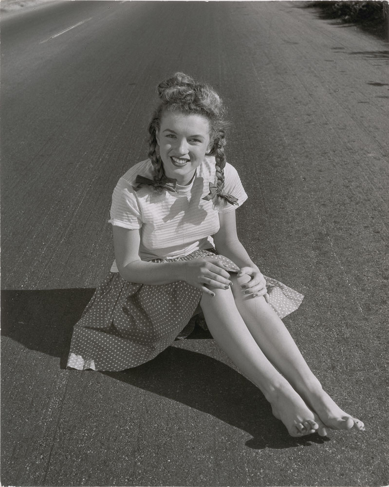 Striking original oversized glossy 10.75 x 13.5 silver gelatin photo of the young Monroe sitting on the road and wearing a star-patterned skirt, taken by Andre de Dienes in 1945. Reverse bears Andre de Dienes credit stamps. In fine condition. From the Globe Photo archives.
