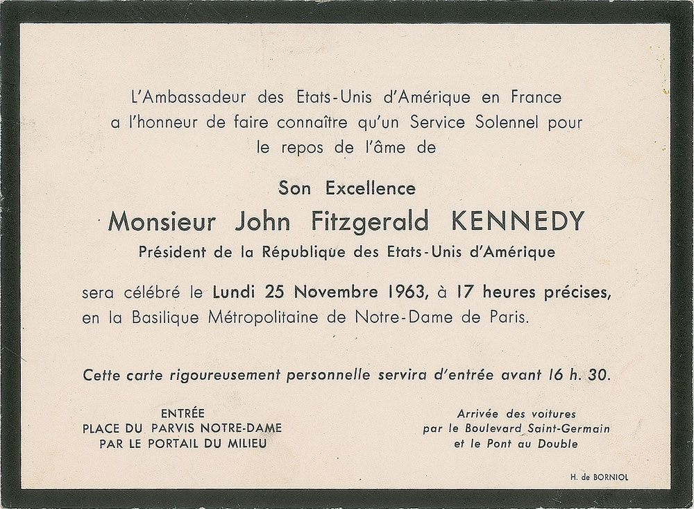 Scarce black-bordered invitation in French from the US Ambassador to France, 5.25 x 4, which announces a “Solemn Service for the repose of the soul of his excellence, Mr. John Fitzgerald Kennedy, President of the United States of America,” to be celebrated in the Metropolitan Basilica of Notre-Dame de Paris, at 5 p.m. on November 25, 1963. In fine condition.
