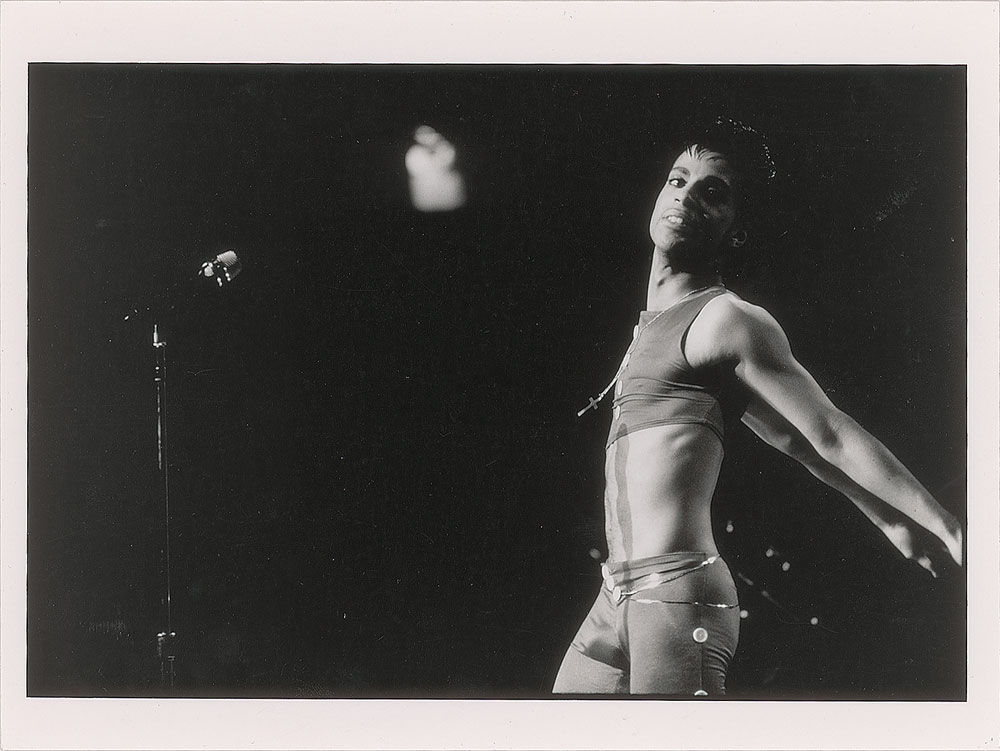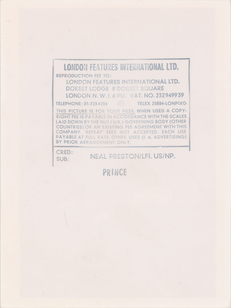 Original vintage glossy 8 x 6 silver gelatin photo of Prince in a crop top and wearing a cross around his neck during the 1986 Parade Tour. Reverse bears a Neal Preston/London Features International credit stamp. In fine condition. Preston is a legendary rock photographer best known for his collaborations with Led Zeppelin, Queen, The Who, Bruce Springsteen, Fleetwood Mac, and Michael Jackson. From the Globe Photo archives.