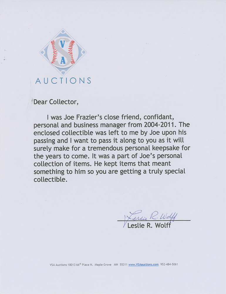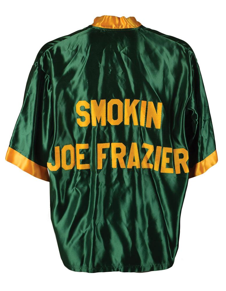 Flashy vintage '70s-era green-and-gold satin professional cornerman's jacket from Joe Frazier's personal collection, featuring "Smokin Joe Frazier" across the black in gold block letters. In fine condition. Consignor notes that this originates from the collection of Les Wolff, who was Joe Frazier’s personal and business manager. This jacket was among the personal items left to Wolff upon Frazier's passing. Accompanied by a letter of provenance from Wolff.