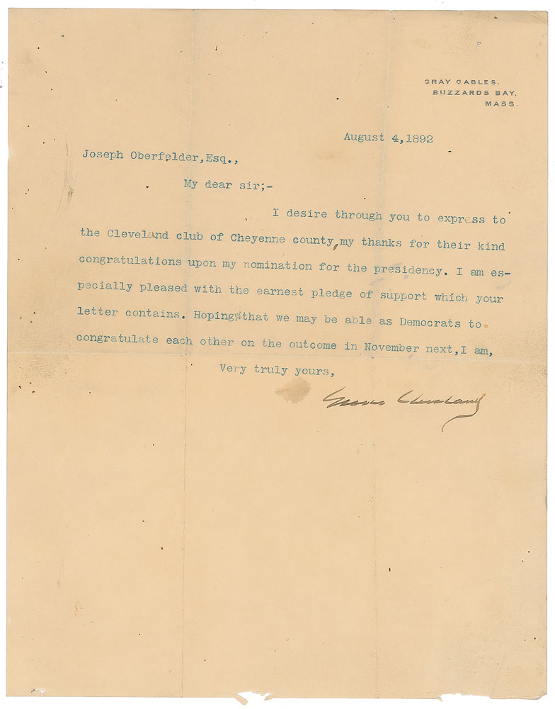 TLS, one page, 7.75 x 10, Gray Gables, Buzzards Bay letterhead, August 4, 1892. Letter to Joseph Oberfelder, in full: "I desire through you to express to the Cleveland club of Cheyenne county, my thanks for their kind congratulations upon my nomination for the presidency. I am especially pleased with the earnest pledge of support which your letter contains. Hoping that we may be able as Democrats to congratulate each other on the outcome in November." In fine condition, with a light stain to the left of the signature, and some small tears to the extreme lower edge.