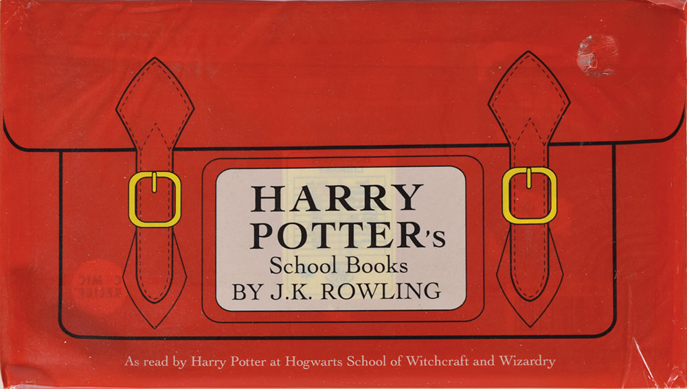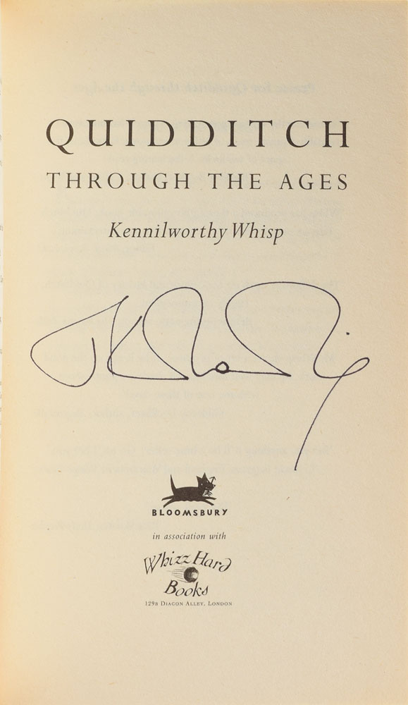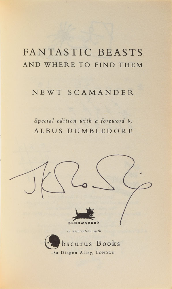 Signed set of two books: Harry Potter’s School Books, including Fantastic Beasts & Where to Find Them and Quidditch Through the Ages. First edition, first printing. London: Bloomsbury, 2001. Softcover, 4.25 x 7, 42 and 56 pages. Each is neatly signed on the title page in black ink, “J. K. Rowling.” Includes the original plastic wrapper and Hogwarts Library bookplate. Autographic condition: very fine. Book condition: VG+/None. Accompanied by full letters of authenticity from Beckett Authentication Services. A very hard-to-find autographed set.