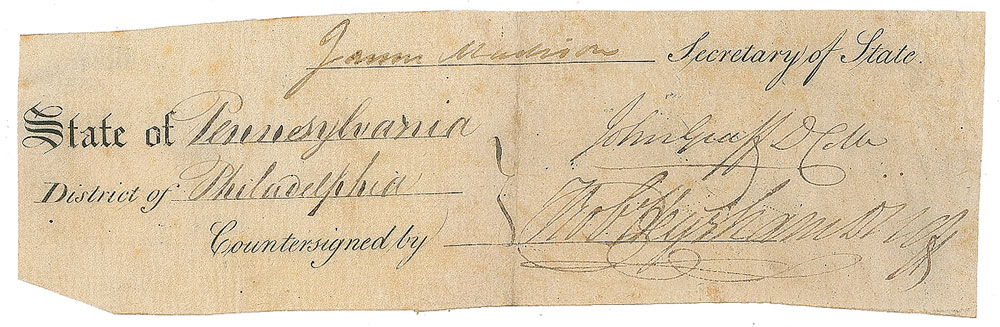 Ink signature as secretary of state, "James Madison,” on an off-white 6.75 x 2 vellum slip clipped from the close of a partly-printed document. In very good condition, with trimmed edges and light soiling.
