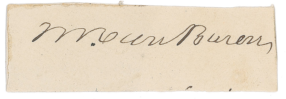 Ink signature, "M. Van Buren,” on an off-white 2.5 x .75 slip affixed to a same-size mount. In fine condition.