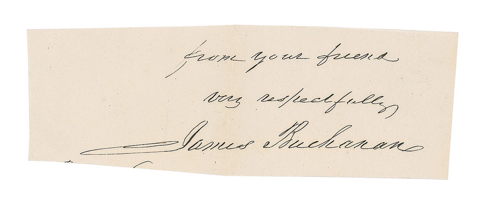 Ink signature, "from your friend, very respectfully, James Buchanan,” on an off-white 4.75 x 1.5 slip. In very good to fine condition, with two vertical creases.