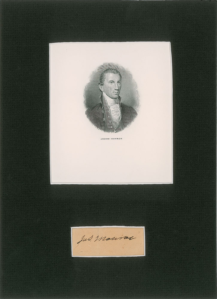 Ink signature, "Ja's Monroe,” on an off-white 2.75 x 1 slip. Matted with an engraved portrait to an overall size of 8 x 11. In very good condition, with scattered creasing, and two tears impinging on the signature.