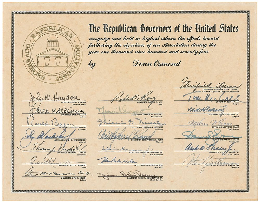 DS, one page, 14 x 11, 1974. A certificate issued by the Republican Governors of the United States to recognize Donn Osmond, signed at the conclusion in black felt tip by Ronald Reagan and in various inks by twenty other Republican governors. Affixed to a same-size mount. Overall toning and one signature a couple shades light, otherwise fine condition.