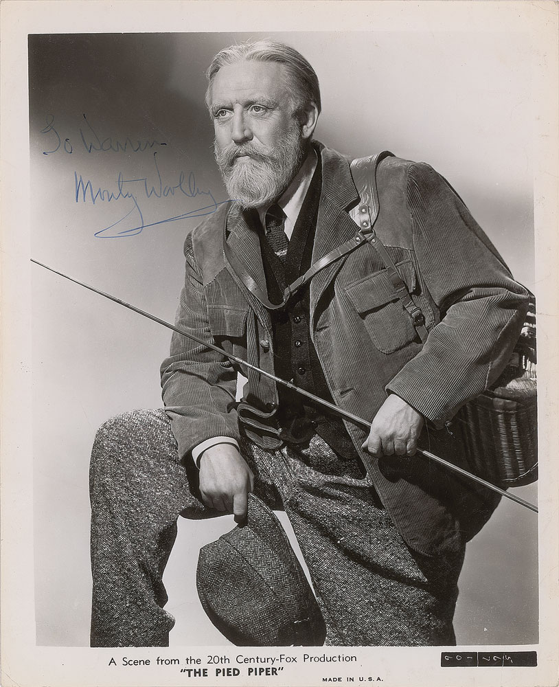 American stage, film, radio, and television actor (1888-1963) who is best remembered for his role in The Man Who Came to Dinner. His distinctive white beard was his trademark and he was affectionately known as 'The Beard.' Vintage glossy 8.25 x 10 Twentieth Century Fox publicity photo of Woolley for the 1942 film The Pied Piper, signed and inscribed in fountain pen, "To Warren, Monty Woolley.” In very good to fine condition, with scattered creasing and surface impressions.