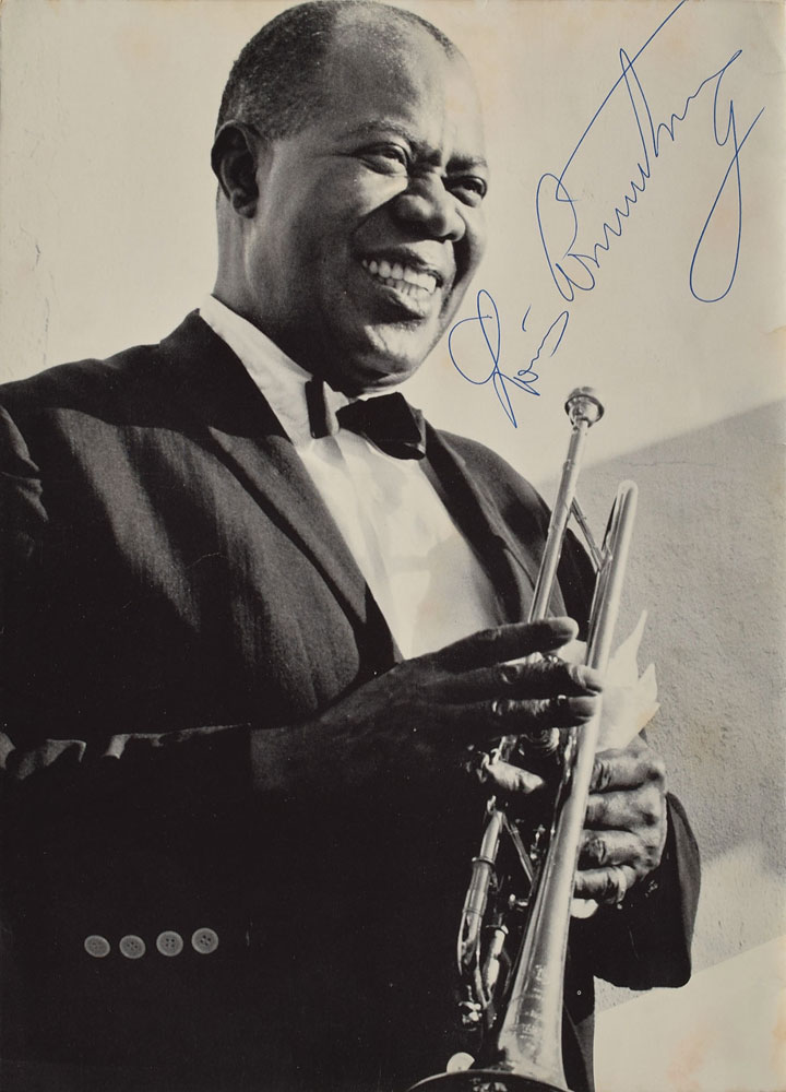 Vintage circa 1965 program for Louis Armstrong and His All Stars, twenty-four pages, 9 x 12, prominently signed on the inside of the front cover in blue ballpoint by Armstrong. In fine condition, with light creasing and handling wear.