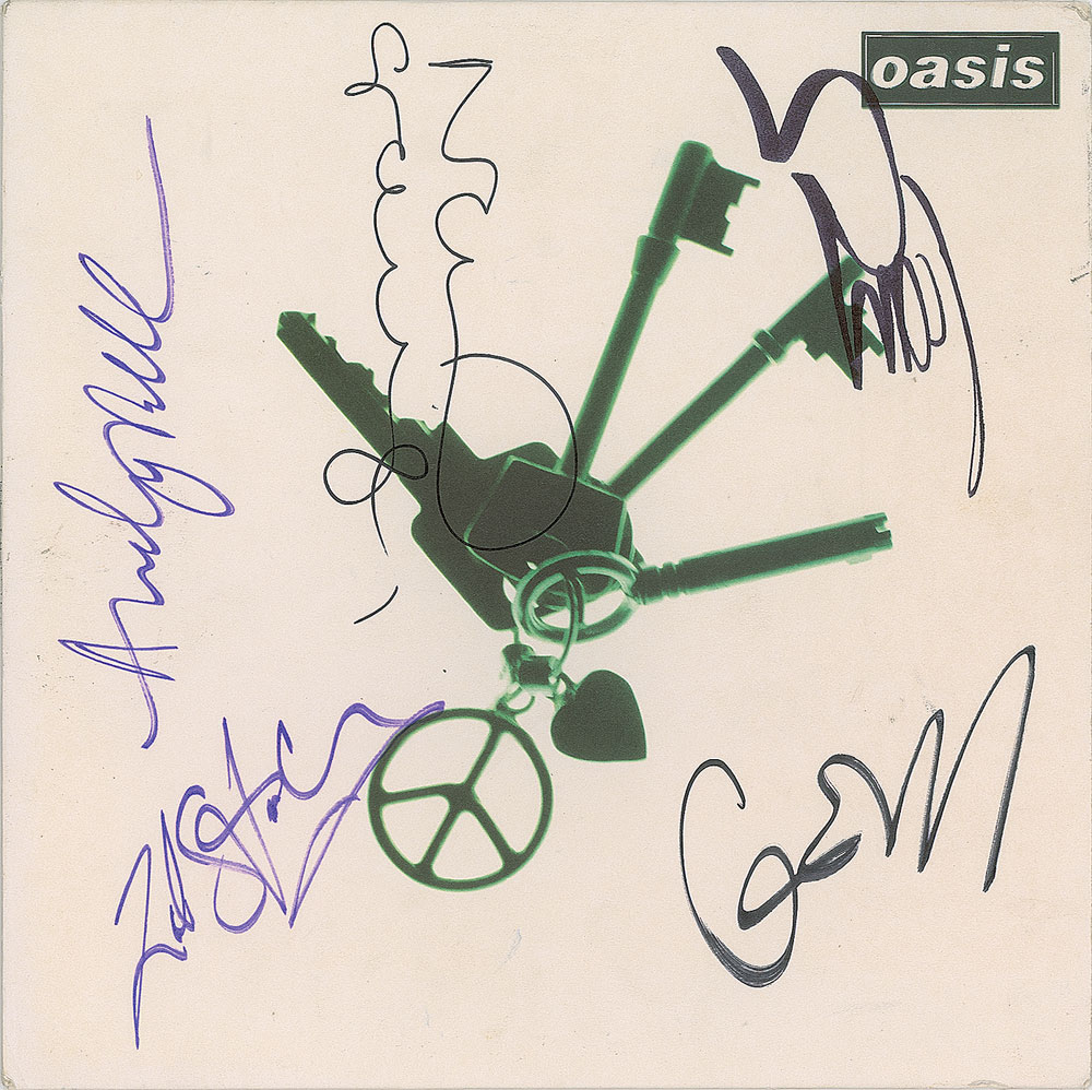 'Let There Be Love' / 'Sittin' Here In Silence (On My Own)' single album signed on the front cover in black felt tip by Noel Gallagher, Liam Gallagher, and Gem Archer, and in purple felt tip by Zak Starkey and Andy Bell, who has also signed on the inner sleeve. In fine condition. The record is not included.