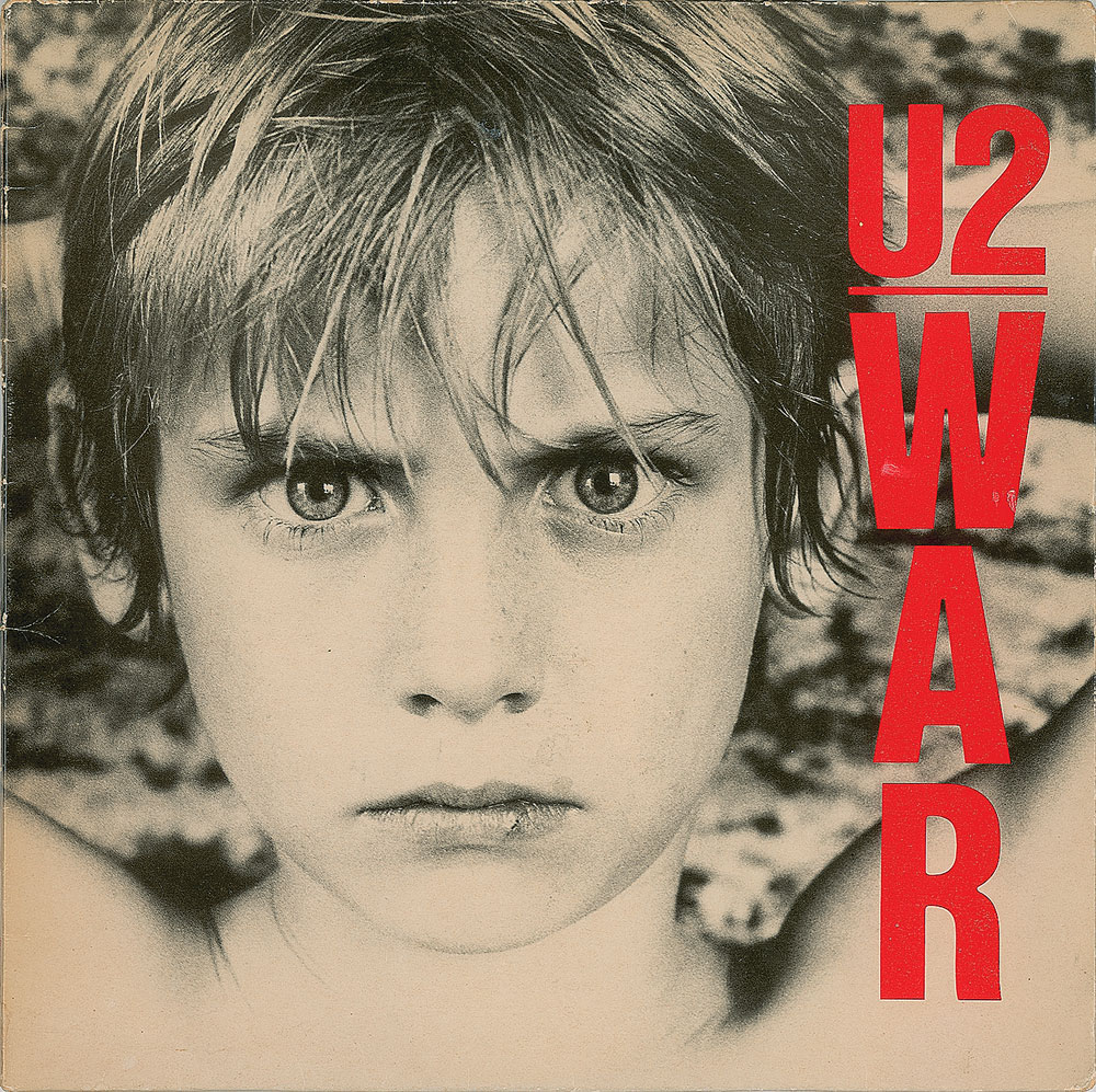 War album signed on the back cover in black ballpoint, "Bono, 83," and in blue ballpoint, "Edge," "Adam," and "Larry." In very good to fine condition, with some surface loss to the edge above Bono's signature. The record is not included.