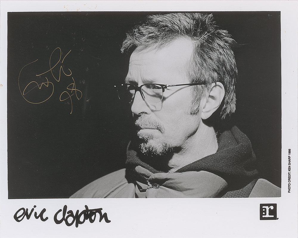 Satin-finish 10 x 8 Reprise Records publicity photo of Clapton in a close-up pose, signed in gold ink, "Eric Clapton, 98." In fine condition, with a few light surface impressions in the signature area.