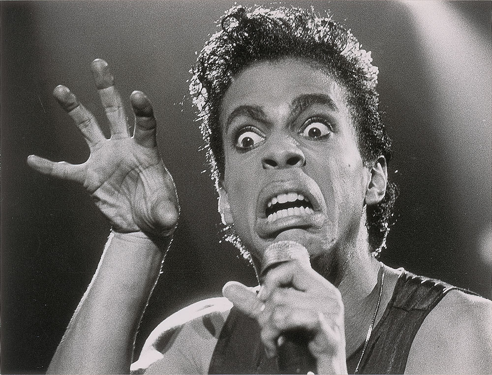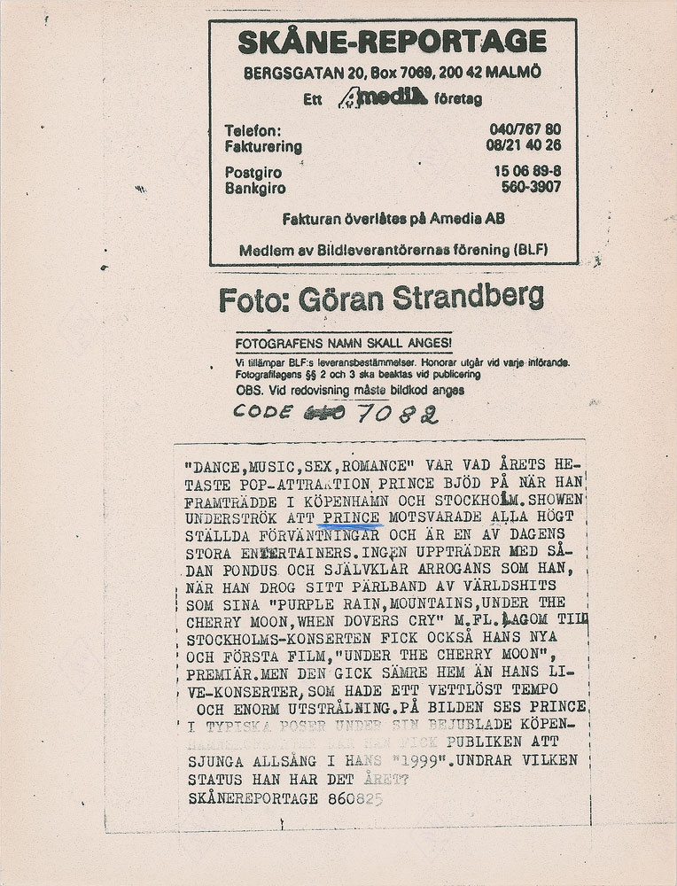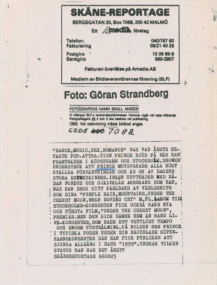 Two original vintage glossy 8.5 x 6.5 silver gelatin photos of Prince performing in Europe during the 1986 Parade Tour, one showing him playing a paisley tambourine and the other a close-up of him making a dramatic face. Both bear Goran Strandberg/Skane-Reportage credit stamps and Swedish captions on the reverse. In overall fine condition.
