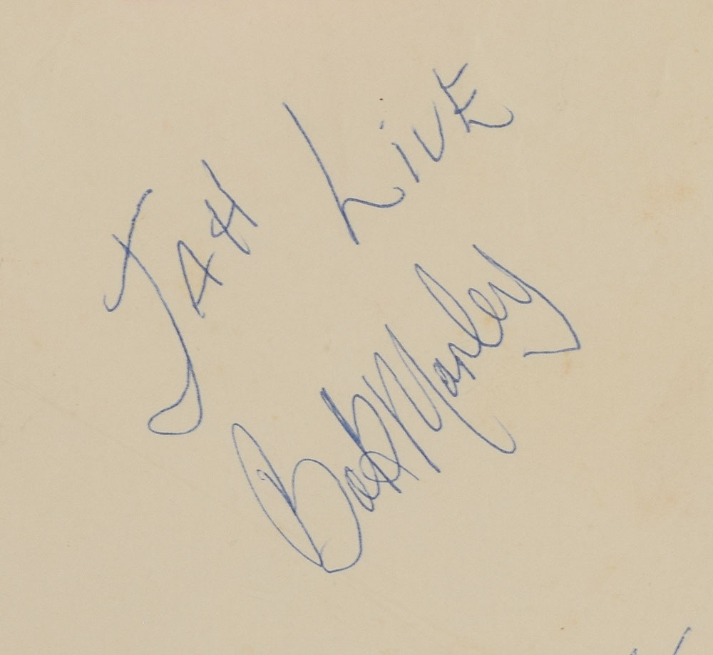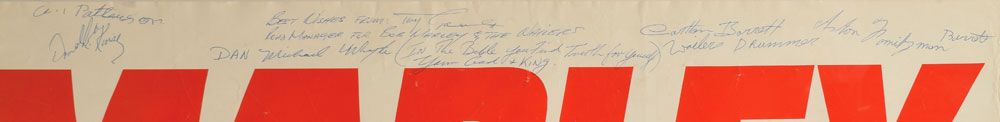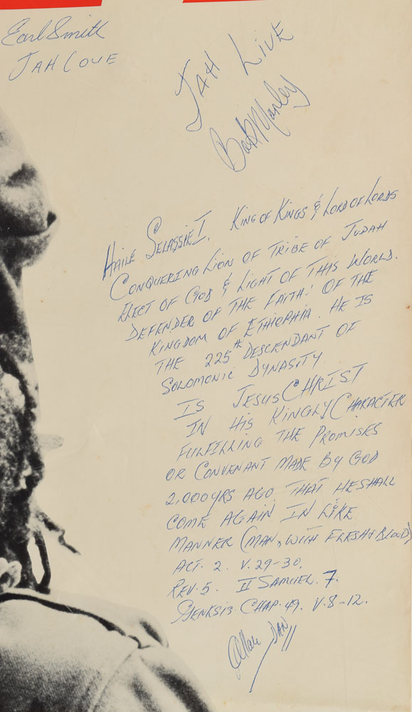 Very desirable color 23.5 x 35 Island Records poster for Bob Marley and the Wailers' 1976 North American Tour, which features a large half-length image of Marley, various tour dates and an image of the cover for the Rastaman Vibration album, and his surname in bold red text along the top. The poster is signed along the right side in blue ballpoint, "Jah Live, Bob Marley," who adds below: "‘Haile Selassie I. King of kings & Lord of Lords, Conquering Lion of Tribe of Judah, Elect of God & Light of This World. Defender of the Faith: of the Kingdom of Ethiopia. He is the 225th Descendant of Solomonic Dynasty. Is Jesus Christ in His Kingly Character Fulfilling the Promises or Covenant Made by God 2,000 Years Ago That He Shall Come Again in Like Manner (Man, with Flesh & Blood), Act. 2. V. 29-30, Rev. 5. II Samuel. 7. Genesis Chap. 49. V. 8-12. Allah Dan." The poster is also signed in thin black felt tip, “Don Taylor, Manager,” and in ballpoint, “Al Patterson,” “Donald Kinsey,” “Best wishes from: Tony Gilbert, Road Manager for Bob Marley & The Wailers,” “Michael Whyte, (In the Bible you Find Truth for yourself, Your God & King),” with an unknown hand adding “Dan” before his name, “Carlton Barrett, Wailers Drummer,” “Aston Family man Barrett,” and “Earl Smith, Jah Love.” Rolled and in very good to fine condition, with scattered light creasing and some light staining near the edges. Accompanied by a certificate of authenticity from Tracks. Consignor notes that the signatures were obtained by a cleaner at a Miami hotel when Marley & the Wailers were staying there during rehearsals prior to their show on June 1, 1976. The Rastaman Vibration Tour began in Upper Darby, Pennsylvania, on April 23, and concluded its North American leg in Natchez, Mississippi, on June 3, 1976, a highly successful run of 27 shows that complemented the impressive album sales of Rastaman Vibration; the record peaked at number eight on the Billboard 200 chart, the first Bob Marley release to reach the top 10, and it featured Marley's most popular US single 'Roots, Rock, Reggae,' the only Marley single to reach the Billboard Hot 100 chart. Signed by nine touring members of the Wailers, and elevated furthermore by Marley’s lengthy Rastafarian verse, this is a rare and highly displayable concert poster dating to the band's most successful period.
