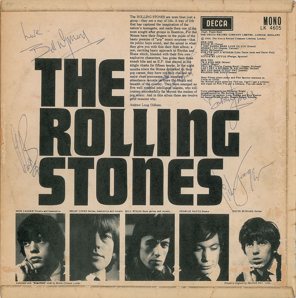 Sought-after self-titled debut album signed on the back cover in black ballpoint, "Love, Bill Wyman," "Charlie Boy," "Keith Richard," "Brian Jones," and "Mick Jagger." In very good condition, with toning, soiling, and scuffing, and small areas of surface loss in the image area at the bottom. The record is included. Accompanied by a certificate of authenticity from Tracks. A wonderful fully signed example with great display value, with its desirable lack of inscriptions further elevating its appeal.