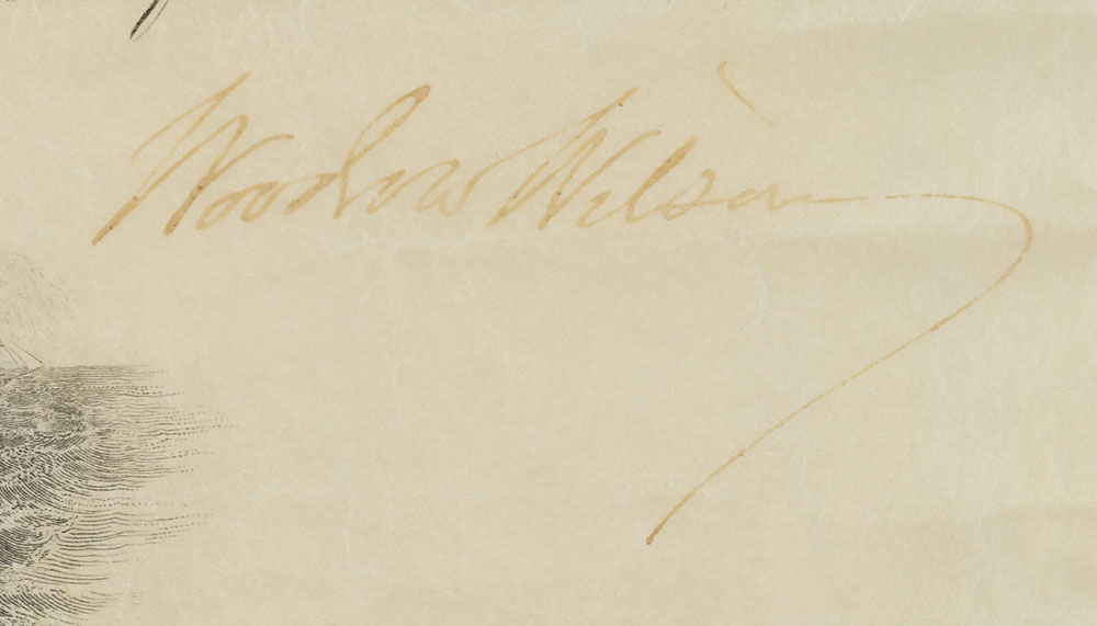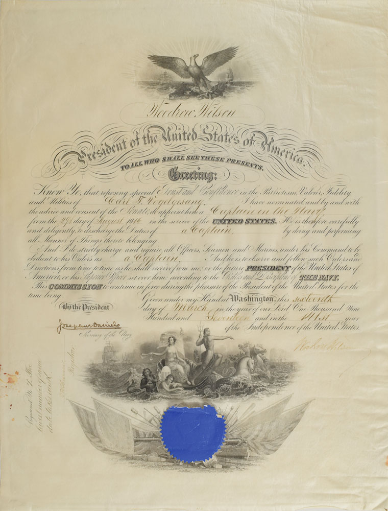 Partly-printed vellum DS as president, one page, 15.75 x 19.75, March 16, 1917. President Wilson appoints Carl T. Vogelgesang as a "Captain in the Navy…in the service of the United States." Signed at the conclusion by Wilson, and countersigned by Secretary of the Navy Josephus Daniels. Blue Navy Department seal remains affixed to lower vignette. In fine condition, with scattered light creasing, and damage to the top of the blue wafer seal. Carl Theodore Vogelgesang was a United States Navy rear admiral and Navy Cross recipient, who was the first US Navy flag officer from California.
