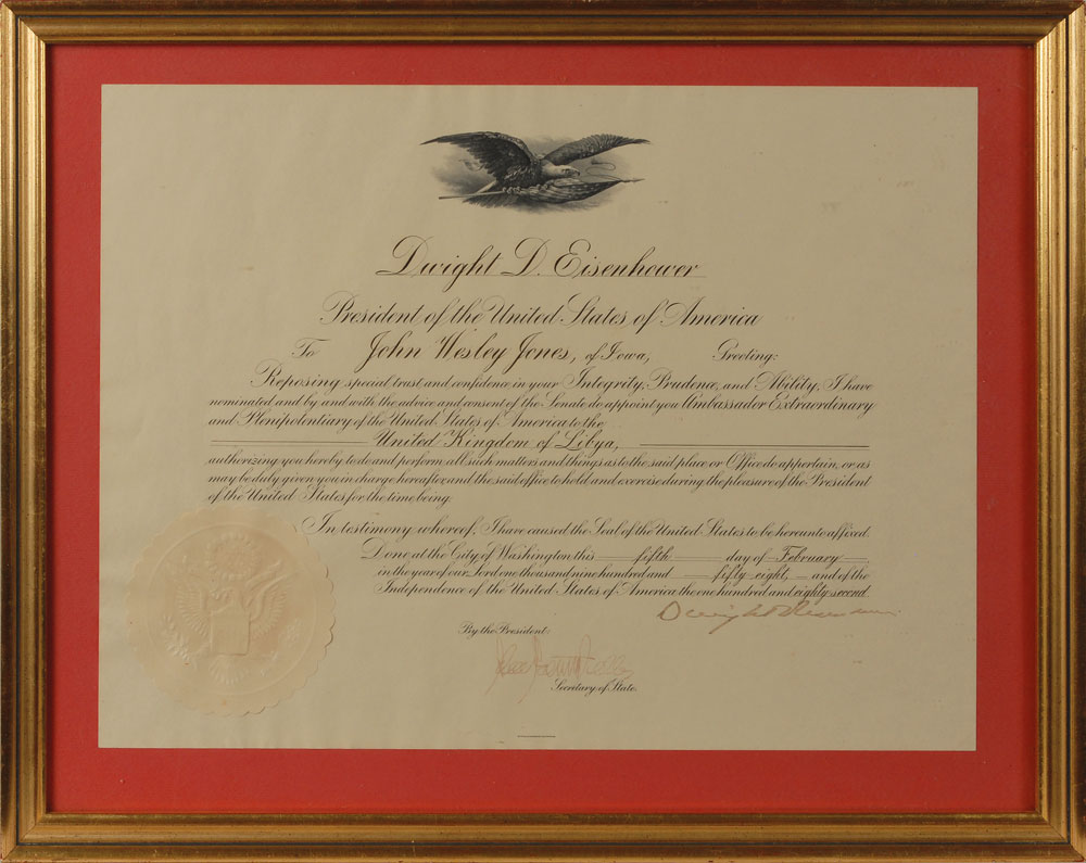 Uncommon partly-printed DS as president, one page, 15.5 x 11.75, February 5, 1958. President Eisenhower appoints John Wesley Jones, of Iowa, as “Ambassador Extraordinary and Plenipotentiary of the United States of America to the United Kingdom of Libya.” Signed at the conclusion by Eisenhower. The white paper seal affixed to lower left remains intact. Framed and in fine condition, with the signature slightly faded.