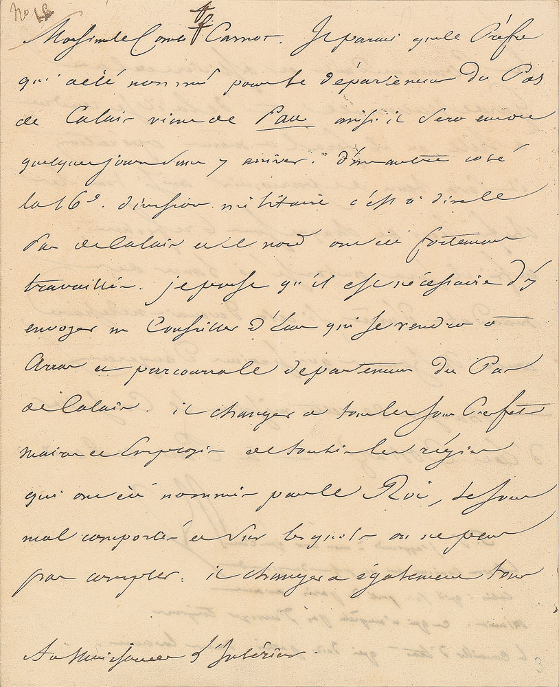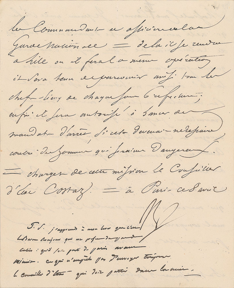 LS in French, signed “Np,” one page both sides, 7.25 x 9, April 8, 1815. Letter to his Interior Minister, the count Carnot, whom he informs about the nomination of a new prefect for the Departement Pas de Calais who was soon to be expected arriving from Pau. The troops in this area (16th division in the north) barely held the line. He proposes that the State Council of Arras should unseat the sub-prefects, mayors and other officials appointed by the King and replace them by others. A postscript in another hand reports the departure of Baron Ronjoux from Paris before midnight; however, this should not prevent the appointment of a city council who is to depart during the night. In fine condition, with intersecting folds and light creasing.