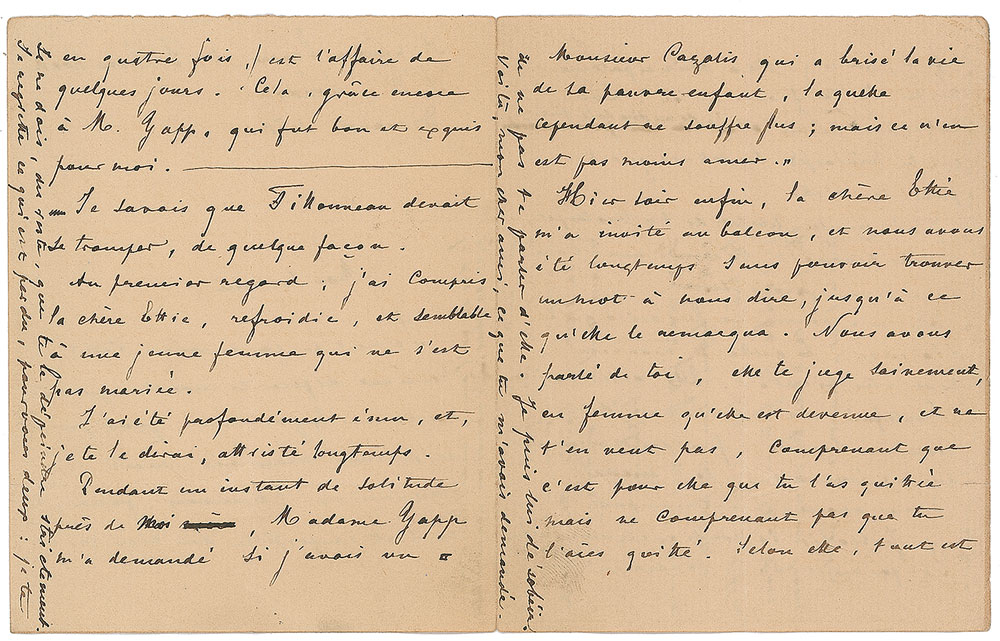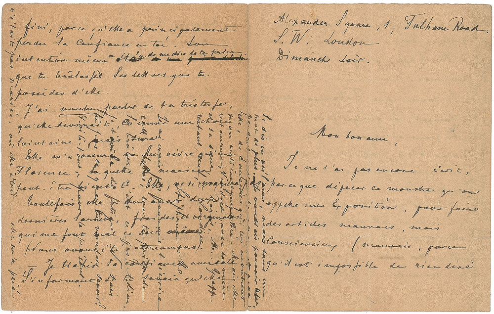 Major French symbolist poet and critic (1842-1898) whose work anticipated and inspired several revolutionary artistic schools of the early 20th century, such as Dadaism, Surrealism, and Futurism. ALS in French, signed “Stephane M.,” four pages on two adjoining sheets, 4 x 5, [August 13, 1871]. Beautiful letter to Symbolist poet Henri Cazalis, written from London, about Cazalis's former fiancee Ettie Yapp, the daughter of a Daily Telegraph correspondent in Paris. In part (translated): "I have not written to you yet, because to cut up this monster called an Exhibition, to make bad but conscientious articles (bad, because it is impossible to say anything in four times,) is the business of a few days. This, thanks again to Mr. Yapp, who was good and exquisite for me." About Ettie Yapp, he writes: "At first glance, I understood dear Ettie, cold, and like a young woman who did not get married. I was deeply moved, and, I will tell you, saddened for a long time. For a moment of loneliness near me, Mrs. Yapp asked me if I had seen 'Mr. Cazalis who broke the life of the poor child, which however does not suffer any more; but is nonetheless bitter.' Yesterday evening finally, dear Ettie invited me to the balcony, and we were a long time without being able to find a word to tell us…According to her, everything is over, because she has mainly lost confidence in you. Her very intention was to tell me to pray to you that you were burning the letters you have from her. I wanted to talk about your sadness, which she guessed, as something distant, but sure. She assured me that she would live only in Florence [her sister], who will perhaps be married soon. She will not marry. However, she has had two last tears, cold and virginal, which hurt me this very evening…I betray her friendly trust. Inquiring if you knew she was not married, where she was - she asked me not to tell you about her." He adds a postscript, "I do not think I can write you this letter, without begging you to burn it, is not it?" In fine condition, with intersecting folds. Accompanied by an export certificate from the French Ministry of Culture, as well as a 1965 issue of Revue d’histoire littéraire de la France, which publishes the text of this letter in an article entitled 'Mallarmé et son amie anglaise.' Yapp would later marry the Egyptologist Gaston Maspero.