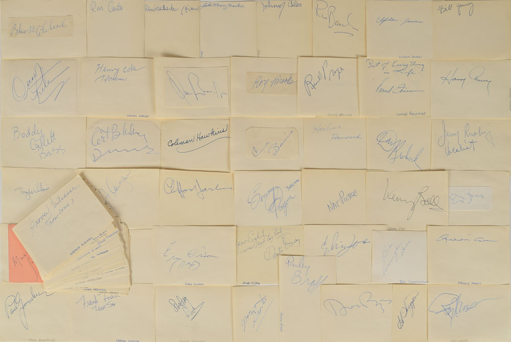 Astounding collection of over 80 signatures of legendary jazz musicians, each signing in ink on individual off-white 4.75 x 3.25 sheets, with musicians including: Cannonball Adderley, Kenny Ball, John Henry Barbee, Chris Barber, Count Basie, Acker Bilk, Art Blakey, Ron Bowden, Rudy Braff, Roy Brooks, Garnett Brown, Oscar Brown, Jr., Ray Brown, Dave Brubeck, Jaki Byard, Don Byas, Harry Carney, Ron Carter, Buddy Catlett, Sonny Cohn, Henry Coker, Johnny Coles, Bob Cunningham, Paul Desmond, Eric Dixon, Harry Edison, Roy Eldridge, Duke Ellington, Tommy Flanagan, Paul Fontaine, Frank Foster, Vernel Fournier, Charles Fowlkes, Bud Freeman, Erroll Garner, Paul Gonsalves, Dexter Gordon, Freddie Green, Jimmy Hamilton, Herbie Hancock, Jake Hanna, Coleman Hawkins, Charles Haywood, Johnny Hodges, Clifton James, Dave Jones, Elvin Jones (2), Jo Jones, Clifford Jordan, Connie Kay, Blue Mitchell, Grover Mitchell, Joe Morello, Ray Nance, Albert Nicholas, Hammie Nixon, Anita O’Day, Sonny Payne, Coleridge Perkinson, Oscar Peterson, Nat Pierce, Russell Procope, Ben Riley, Charlie Rouse, Marshal Royal, Jimmy Rushing, George Russell, Sahib Shihab, Wayne Shorter, Horace Silver, Sunnyland Slim, Sonny Stitt, Billy Strayhorn, Ed Thigpen, Butch Warren, Ron Weatherburn, Frank Wess, Cootie Williams, Tony Williams, Jimmy Woode, Sam Woodyard, and Bill Yancey. In fine to very fine condition. An exceptional assemblage of some the biggest and most influential names in jazz.