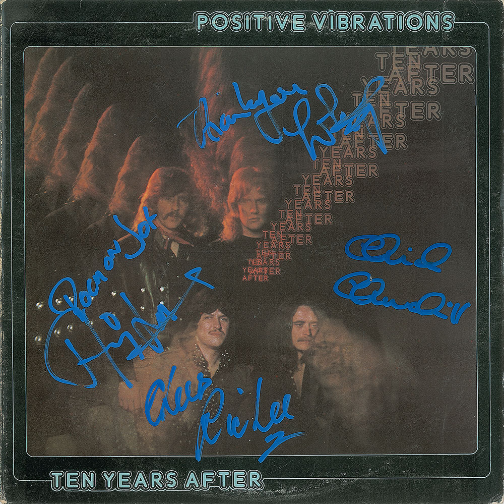 Positive Vibrations album signed on the front cover in blue paint pen by Alvin and Ric Lee, Chick Churchill, and Leo Lyons. In fine condition. The record is included. Consignor notes that the signatures were obtained at Cleveland's Bond Court Hotel before a show.