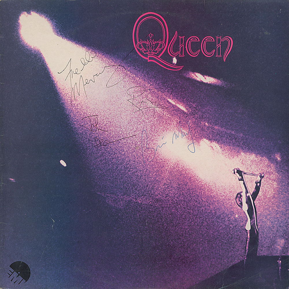 Self-titled debut album signed on the front cover in blue and black ballpoint by Freddie Mercury, Brian May, Roger Taylor, and John Deacon. In fine condition, with a few creases and some light contrast to signatures. The record is included.