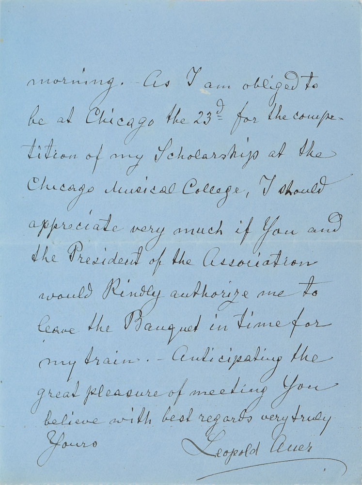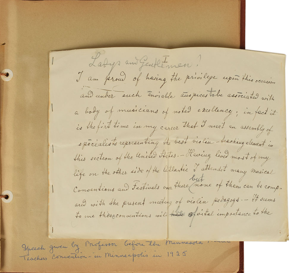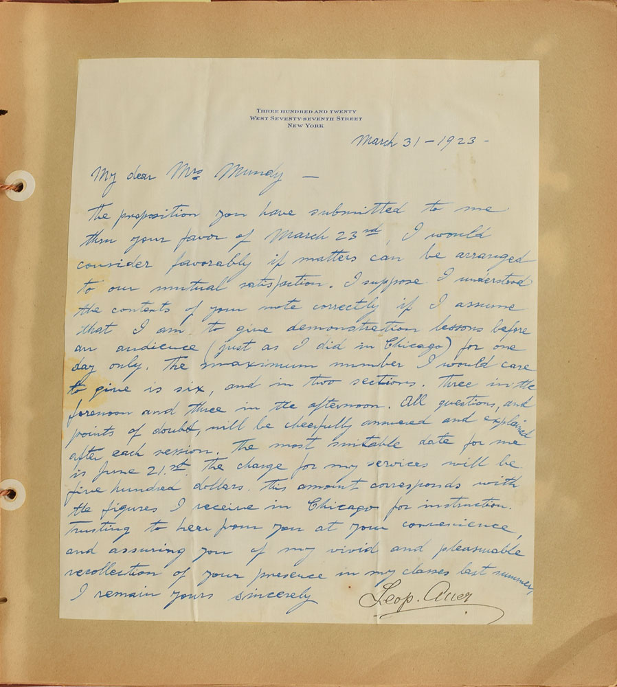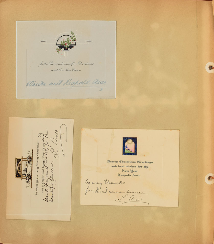Hungarian violinist, conductor, and composer (1845-1930) who was renowned as a violin teacher; among his top students were Jascha Heifetz, Nathan Milstein, and Mischa Elman. Scrapbook compiled by one of Auer's students, containing a signed photo, four ALSs, one LS, a TLS, two signed Christmas cards, and a handwritten speech, as well as a variety of unsigned newspaper clippings, program pages, and original photographs affixed within. Highlights of the scrapbook include: a glossy 8 x 10 Underwood & Underwood photo of Auer holding his violin in a three-quarter-length pose, signed in fountain pen, "L. Auer, 1924"; two Christmas cards signed by Auer, "L. Auer," and one signed by his wife Wanda, "Wanda and Leopold Auer"; a 1923 ALS signed "Leopold Auer," in part: "I am keenly interested in the meeting of your association at Saint Paul; this will be my maidenly appearance as a teacher before such a numerous assembly of specialists"; a 1923 ALS signed "Leop. Auer," in part: "I am delighted to learn…that you as well as the teachers were satisfied with my first demonstration class. I am proud of my success in this new field for me…I miss you painfully in my summer class both as one of the most gifted students, and secondly, as a friendly and sympathetique personality among strangers"; a 1923 ALS signed "L. Auer," accepting a lunch invitation; a 1923 LS signed "Leop. Auer," concerning arrangements for his demonstration lessons; a 1924 ALS signed "L. Auer," sending his schedule; a three-page handwritten speech by Auer, given before the Minnesota Music Teachers Convention, beginning: "I am proud of having the privilege upon this occasion and under such enviable auspices to be associated with a body of musicians of noted excellency; in fact it is the first time in my career that I meet an assembly of specialists representing the best violin-teaching element in this section of the United States"; and a 1927 TLS signed "Prof. L. Auer," recommending his correspondent, in part: "Mme. Lota Mundy has been my pupil for several seasons. Her familiarity with my method of teaching enables her to impart instructions in full accordance with it. She also excels as an artistic and musicianly concert soloist." Also affixed within the scrapbook are two additional letters by his wife Wanda Bogutska Stein (one showing the front only), as well as a printed announcement of their 1924 wedding. Two of the letters, a photo, and some programs are loosely laid in and not affixed to the scrapbook pages. In very good to fine condition.